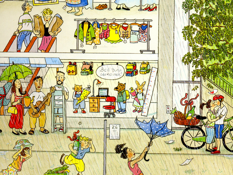 Похоже на вид из окна поезда, медленно проезжающего через город. А за окошком поезда – человечки, такие яркие, живописные «фрики», как теперь говорят. Много-много персонажей, которые тоже – «детали» и уравнены «в правах» с предметами. Человеческие лица нарисованы по принципу «точка, точка, два крючочка». При этом у каждого лица – свое выражение. Просто удивительно, что точками и крючочками можно изобразить такое количество разных выражений на лицах. Предметы (машины, игрушки, платья в магазине, посуда, воздушные шары, пищевые продукты), как и люди, живут своей «полноценной» жизнью. Они существуют на грани «одушевленности» и нередко вступают с персонажами-людьми в игровое общение.