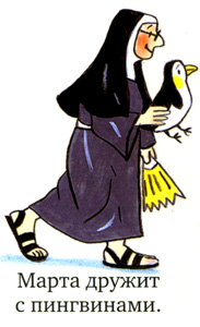 А романические ситуации рисуночного повествования Бернер еще и замешены на юморе. Способность к восприятию юмора не дается от рождения. Она развивается с возрастом (и то при особых благоприятных обстоятельствах). Дети «от двух до пяти» способны воспринимать юмор в формате «жабы по небу летают». Но не в формате «Марта дружит с пингвинами». Последнее требует слишком изощренной расшифровки: Марта – монахиня. Она одета в черно-белое. Марта нашла пингвина (игрушечного!), в котором обнаружила «родственную душу», потому что он (прости, Господи) тоже черно-белый. И т.п.