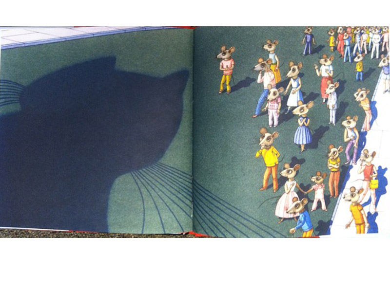Читая в первый раз, мы, конечно, думали, что кот идет съесть мышат. И мой сын, использовав все свои знания о взаимоотношениях котов и мышей, поначалу добавлял к «Сюда идет кот!» выкрики вроде: «Бегите! Спасайтесь!» Особенно было жутковато, когда мы открыли одну страницу и увидели огромную кошачью тень. «Вот кот!» – предупредил Алик мышек. А мордочки у мышей по-разному выражают не то чтобы страх, но обеспокоенность или ожидание. Теперь Алик каждую мышку «озвучивает» – ведь они в самом деле словно живые. Вот эта мышка-мама говорит: «Оh my!» (что-то вроде «О Боже!»), а другая говорит: «Ох!»