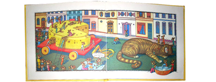 Триллер, к счастью, заканчивается на следующей странице, где выясняется, что кот хороший, потому что принес он мышам большущий кусок сыра! По этому случаю в мышином городе пир горой.