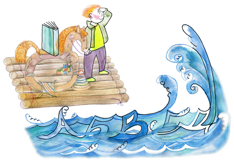 В азбуке опять корабли, и пароходы, и рыбы, и птицы – всё разрисовано красками и золотом. К азбуке указочка была костяная резная. Грамоте больше учила мама. Букву А называла «аз», букву Б – «буки», В – «веди», Г – «глаголь», Д – «добро». Чтоб я скорее запомнил, шутя говорила, что начертанья А и Б похожи на жучков, буква В – будто таракан, Г – крюк.