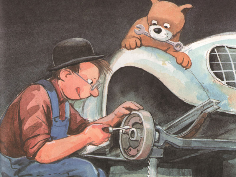 И вот однажды Мулле решил сделать автомобиль, да не просто так, из праздного любопытства, а чтобы уехать на нем далеко-далеко, навстречу неизведанному: «“Послушай, Буффа, – сказал он. – Скучно всегда сидеть дома. Как ты думаешь, что там за горой, на другом конце дороги?” Буффа не умела говорить, но ей тоже было интересно, куда ведет дорога». Маленький читатель наверняка одобрит эту идею. Примерно к четырем годам дети начинают испытывать потребность в расширении привычного домашнего мира и чувствуют себя готовыми к новым впечатлениям и открытиям.