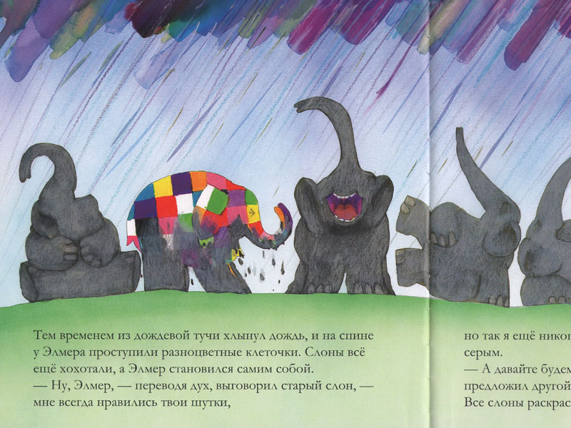 И все-таки когда ты так радикально отличаешься от других, невольно задумаешься, не лучше ли быть «обыкновенным слоном обыкновенной слоновьей масти». И Элмер стал мучиться вопросом: а вдруг слоны смеются не над его шутками и розыгрышами, а над ним самим? В приступе отчаяния он перекрасился в серый цвет – вывалялся в каких-то странных ягодах – и некоторое время радовался тому, что его перестали узнавать. Но вскоре это ему наскучило – ведь он привык быть в центре внимания. И оказалось, что другим слонам тоже совершенно необходим клетчатый и дурашливый Элмер – без него они сразу становятся «серьезными, молчаливыми и неподвижными».