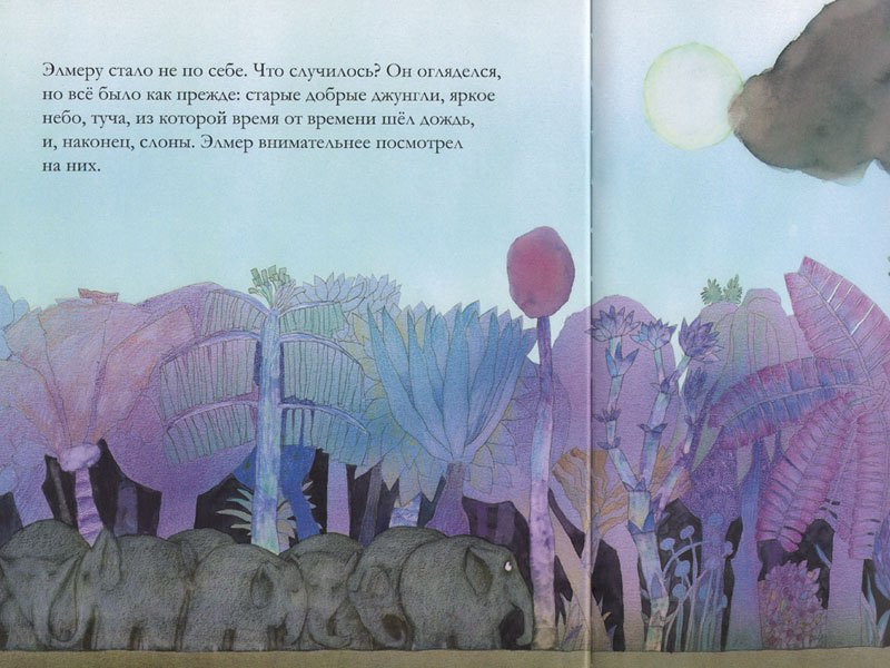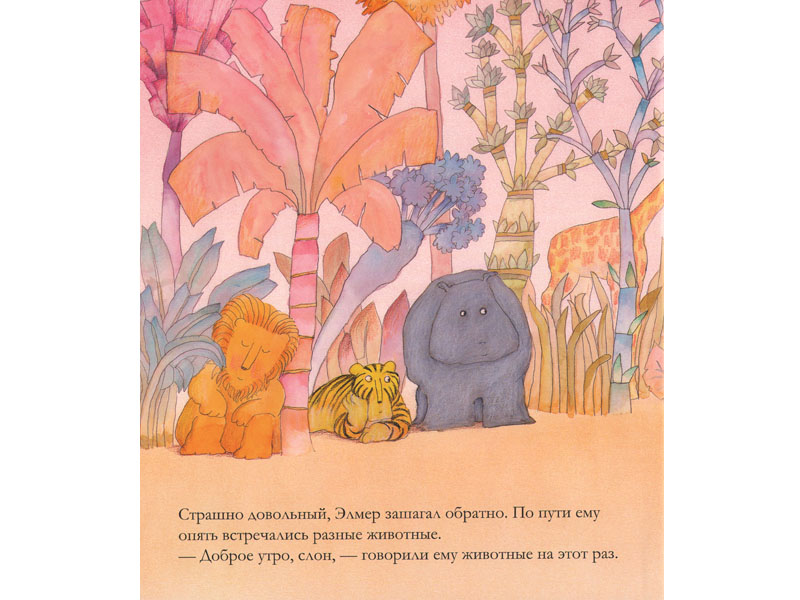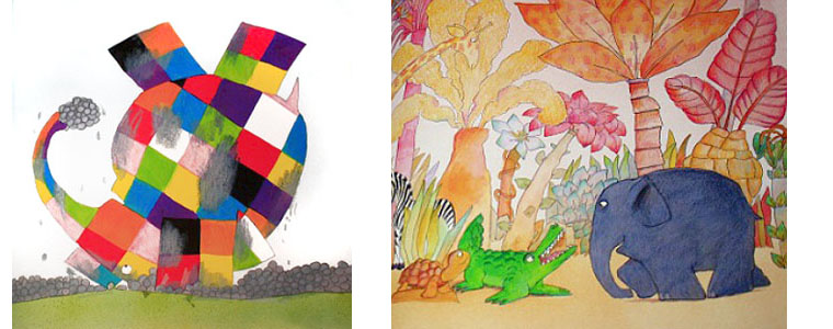 На иллюстрациях к своей книге Дэвид Макки изобразил совершенно фантастические джунгли: ослепительно желтые днем, перламутрово-розовые перед рассветом, черничные в дождь. Растительность поражает воображение буйством цвета, разнообразием форм и причудливостью линий. Но даже в таком необыкновенном окружении, среди всех прочих обитателей джунглей, которые, кстати сказать, выглядят весьма экстравагантно, Элмер с его геометрическим «противоестественным» узором на коже все равно выделяется. Маленькие читатели скорее всего смогут оценить художественные находки Дэвида Макки, потому что они близки стилю их собственного рисования.