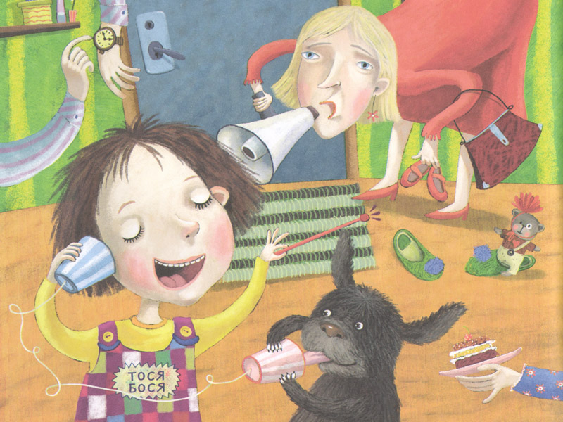 Мои слушатели серьезны: «Может, правда, у нее грязь в ушах?» Но нет, всё абсолютно чисто, никакой болезни нет. И тем не менее мы видим, как Тося-Бося завороженно смотрит телевизор, не обращая внимания на зовущих ее родителей. Вообще-то, ситуация не самая редкая: «У меня тоже так бывает! А я когда мультик смотрю, даже рот иногда открываю и не замечаю этого!» Но на следующем развороте оказывается, что дело не в мультиках: Тося-Бося увлеченно воздвигает башенку из чашек на собственном лбу («играет в цирк», как назвали это дети) и долго не реагирует на приглашение к обеду. За столом она поглощена игрой с собачкой, и когда мама произносит ключевую для сюжета фразу: «Тебе, наверное, уши ни к чему, раз ты ими не пользуешься», Тося-Бося беспечно поддакивает, не вслушиваясь в ее слова...