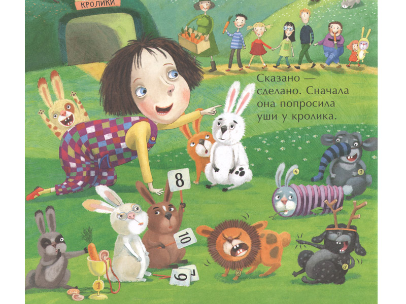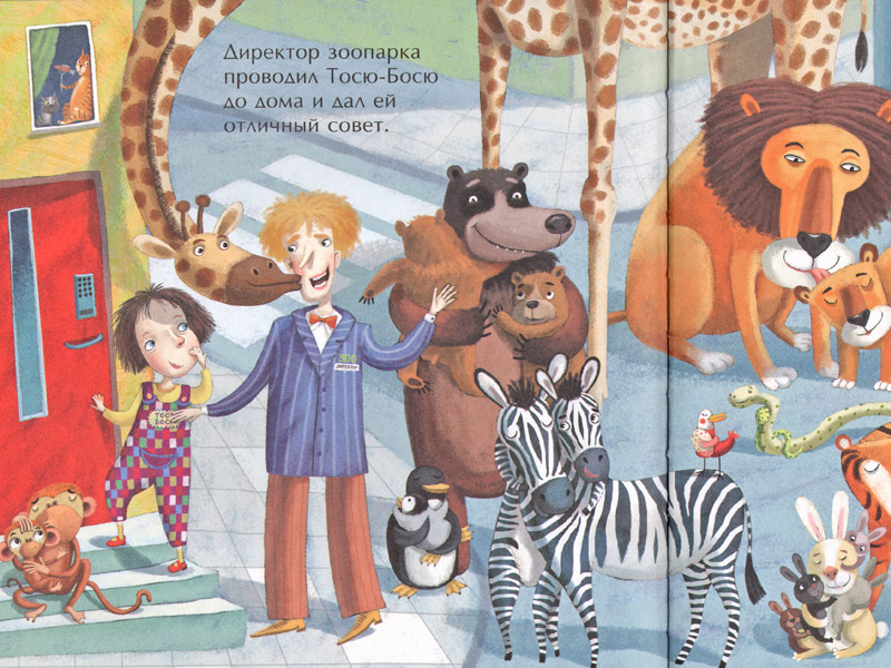 Наконец, мы возвращаемся к истории, которая уже близится к финалу: «Директор зоопарка проводил Тосю-Босю до дома и дал ей отличный совет...» Дети сразу отмечают: «Ой, он всех зверей с собой привел!» – и действительно, на развороте много разных животных с детенышами. Это наводит кое-кого на предположение: «Он дал ей совет, что надо позвать родителей и вместе уши искать!»