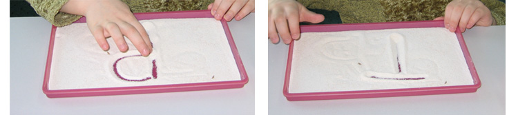 Еще один способ – слой манной крупы в глубокой тарелке, которая позволяет выводить буквы, как на песке. Манка приятна на ощупь, и старшая сестра с удовольствием играет вместе с Саней: «Ну-ка, что я написала? Эту букву знаешь?»