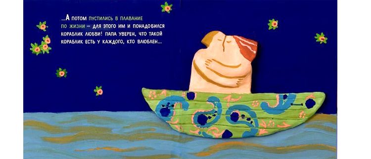 Другая моя книга, «Кораблик любви» – это скорее истории для развития созерцательного восприятия. Я там в картинках цитирую полет влюбленных Шагала. Это книжка про любовь и рождение детей. Главная ее цель – рассказать, как это красиво. И как сделать, чтобы ребенок поговорил со своими мамой или папой, откуда он появился. Чтобы этот разговор над книжкой стал семейной историей. Мне многие мамы рассказывали, что у них так и получилось.