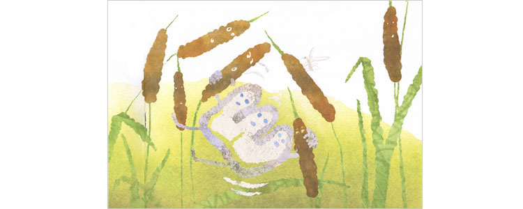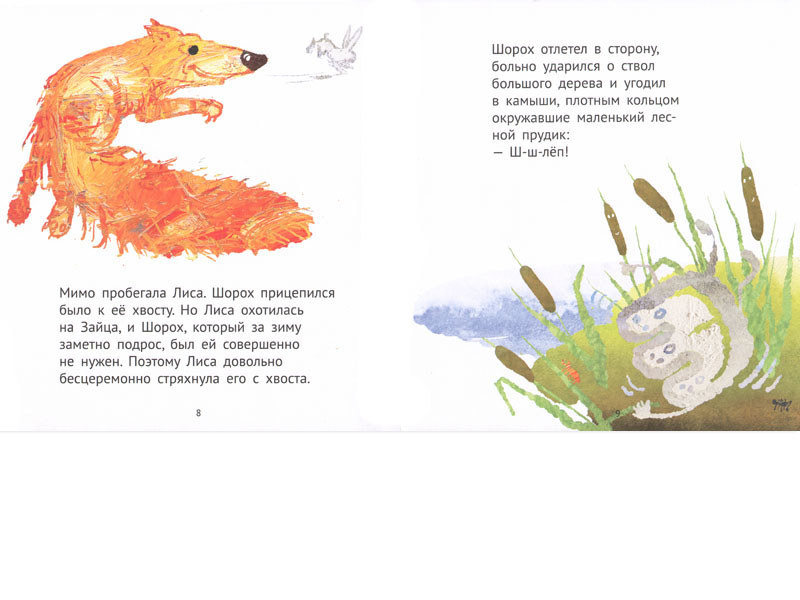 С «Шорохом» дело обстояло сложнее. В книге он рождается, растет, находит друзей и новый дом, живет себе вполне обычной жизнью. По всем признакам это должно быть какое-то дикое русское животное. Я не хотела просто переводить на английский слово «шорох» и все пыталась произвести «шуршащий» звук с помощью того, что было под рукой: одеяла, книжки и даже детских волос. Дети вроде поняли, что это такое. Читаем дальше. Шорох ушел от ежихи: «Куда податься?» Сын кричит: «На речку!» Дочка: «На море! Если есть лес, значит где-то должно быть море». Это, видимо, сказывается, что мои дети выросли в Северной Калифорнии. Но и звук уловили точно, и почти угадали место – Шорох попал в камыши на прудике.