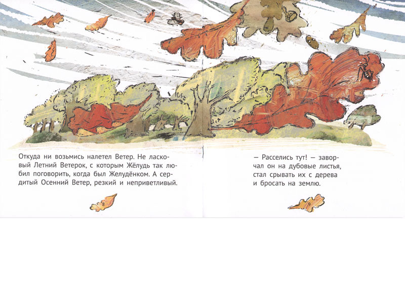 Уже точно зная, что такое желудь, мы прочитали книгу еще раз и решили ее обсудить. Я спрашиваю, что им понравилось. Сын, не задумываясь: «Шапочка! Потому что у нее хвостик есть». Нашел у себя «шапочку с хвостиком» и стал падать на пол желудёнком. А дочка ответила уже более серьезно: «Мне понравилось, что это история о жизненном цикле и здесь в деталях написано, как вырастает дуб».
