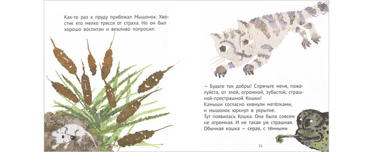 Мой пятилетний сын только начал учить русский алфавит, и с особой радостью везде выискивал букву «Ш». Тут Варя подметила, что на странице с камышами много слов с буквой «Ш»: и камыШи, лягуШка, сам Шорох, а потом еще коШка и мыШонок. И даже в моем имени есть немного «Шороха», я же МаШа. Я спрашиваю, будут ли мышонок и Шорох друзьями. Дети решили, что наверняка да. У них же так много общего! Буква «Ш», например. Алик сказал: «Мне нравится, как Шорох помогает мышонку, потому что надо помогать, если кто-то в беде».