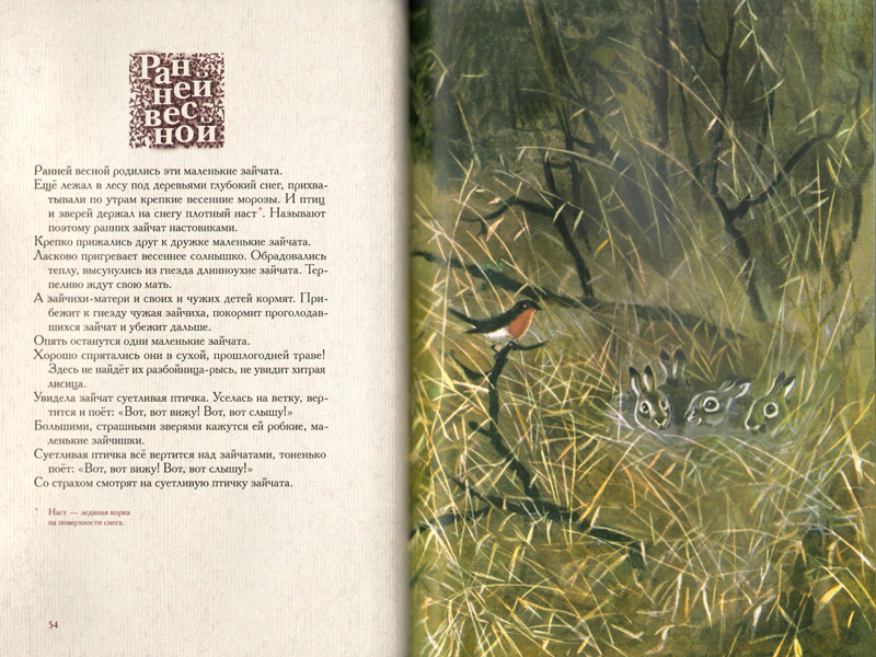 «Лесной год начинается зимой. Сугробы, обглоданные осины, следы птиц и зверей. Светает. Возвращается с охоты лис. Все видит, все слышит, все знает он в лесу… Вот и день наступил. Тетерева клюют березовые почки. Лось перебегает расчищенную дорогу перед лесовозами. Спят медведи в берлогах, сосут молоко маленькие медвежата. Ночь настает…»