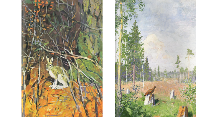 Автором визуальных образов соколовского леса стал Георгий Никольский. Его живописные иллюстрации – настоящие картины, созданные специально для книги «Год в лесу». Они не только точно передают внешний облик животных, настроение леса. Никольский сумел придать каждому животному какую-то особую, индивидуальную характеристику. Звери Соколова-Микитова и Никольского умеют чувствовать так же, как люди. Вот трусливый заяц: «Почти весь год в страхе живет зайчишка-беляк. А всего страшнее ему в осенние прозрачные дни…» Рядом с ним – осторожная и заботливая глухарка, которая зорко сторожит свой «детский сад».