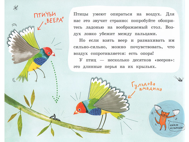Как это часто бывает, чтобы ответить на такой с виду несложный вопрос, пришлось рассказать о множестве самых разных вещей и понятий. В результате из этой яркой (благодаря отличным иллюстрациям Алины Рубан) и ясной книжки можно узнать все самое интересное о птицах, крыльях и полетах.