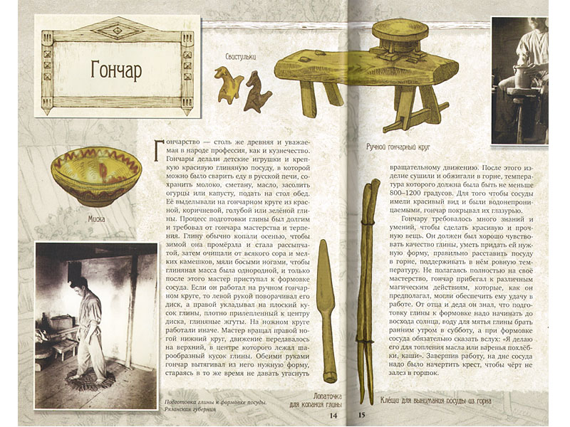 Наши предки, жившие в деревнях и сёлах, были настоящими умельцами и прежде всего ценили друг в друге трудолюбие. Каждый мужчина мог вспахать и засеять землю, срубить баню или избу, а женщина - спрясть не один моток нитей и выткать из них полотно. Но на этом занятия русских крестьян не заканчивались, ведь в деревне бытовали самые разные промыслы и ремёсла. Эта книга познакомит юных читателей со смолокуром и кожемякой, коновалом и кружевницей и многими другими мастерами своего дела, каждую главу о которых сопровождают старинные фотографии и красочные рисунки. А ещё ребята узнают, что значит "наводить украсы", без кого на деревне не обходился ни один праздник, у кого просили разрешения на работу лесорубы и зачем сеятель закапывал в землю два красных яйца.