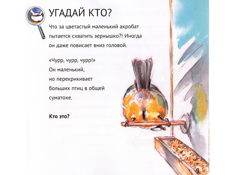 Как построена книга? На каждой странице картинка-загадка: КТО ЭТО? ребенку предлагается угадать, кто прячется на картинке (кто-то высунул хвостик, кто-то зарылся в песок, кто-то прячется в листве). Затем переворачивайте страницу и читайте ответ: как называется птичка, чем питается, какие у нее особые приметы и привычки. Книга развивает любознательность, внимательность. Помогает лучше узнать мир, в котором живет малыш.