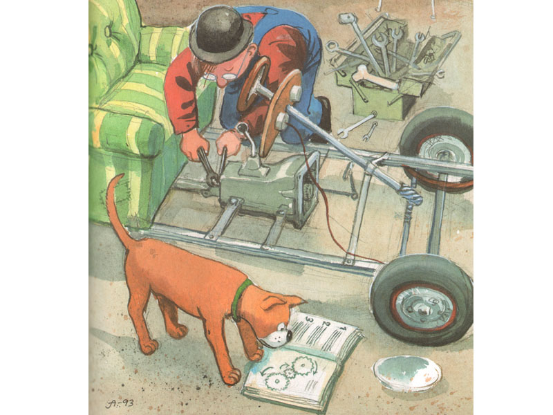 Механик Мулле Мек живет в уютном домике на опушке леса вместе со своей верной помощницей собакой Буффой. Мулле - мастер на все руки! Из груды ржавых железок он может собрать все что угодно, даже самый настоящий автомобиль - с колесами, коробкой передач, приборной доской, мотором и всем-всем, без чего ни одной машине никак не обойтись. На таком автомобиле можно долго ехать по дороге и укатить далеко-далеко, туда - где все другое!