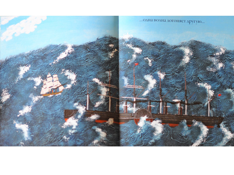 Краткий описательный текст Льва Толстого вдохновил петербургского художника Михаила Бычкова на создание потрясающих живописных полотен, раздвигающих привычные рамки книжной иллюстрации. Спокойное или бурное, море на них не пустынно, по его волнам плывут красавцы-корабли: греческие галеры и дракары викингов, каравеллы Колумба и китайские джонки... Ведь в истории человечества не было времени, когда люди не пытались бы преодолевать морские просторы.