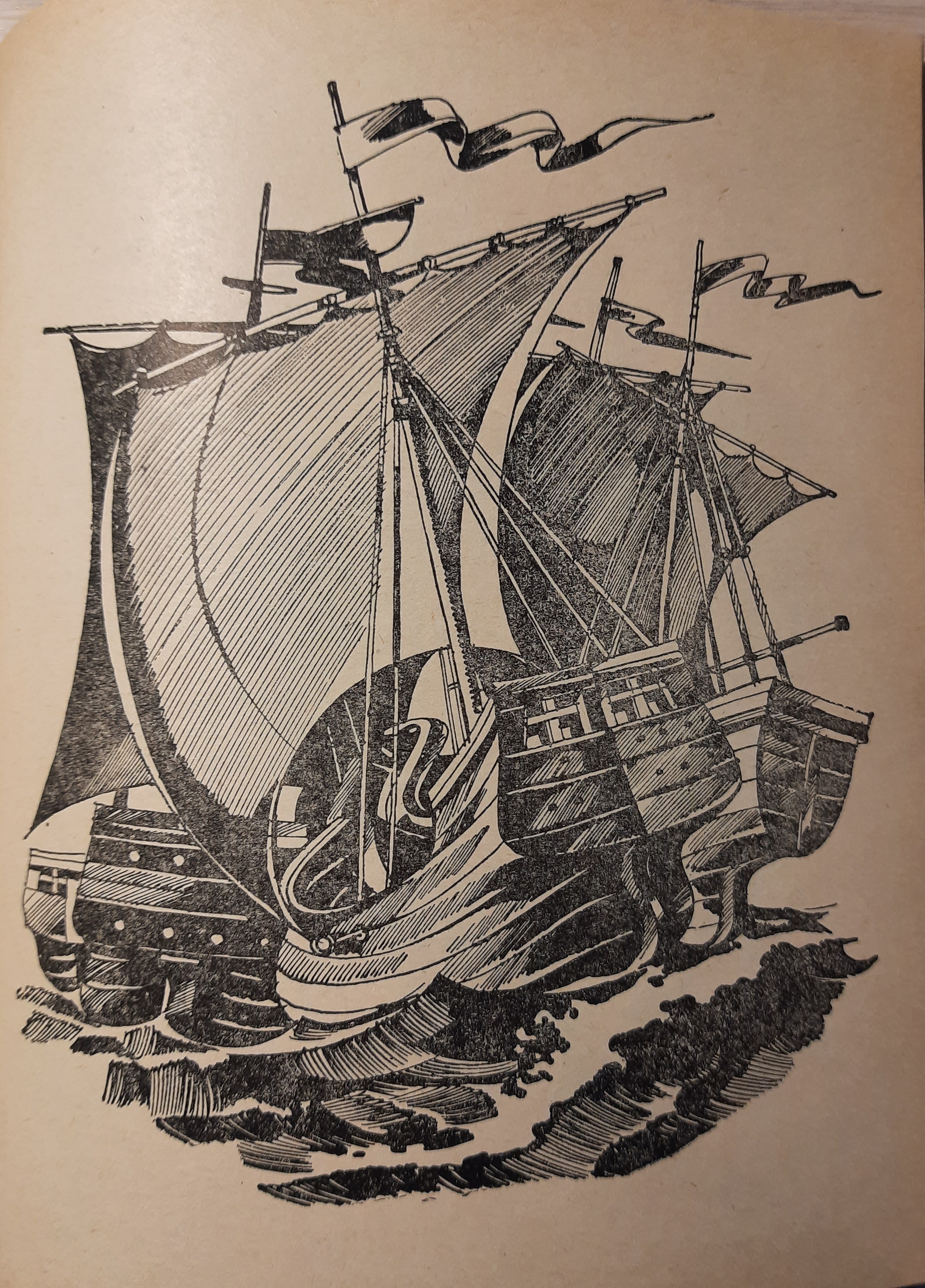 Очень нравится страница с изображением: «Корабли за кораблями с парусами и гребцами…». Тут художник нас переместил в морскую даль, где корабли бороздят водные просторы, где под узкой белой каймой пены морская пучина, где чем глубже, тем интенсивнее цвет море – темнее и таинственней…